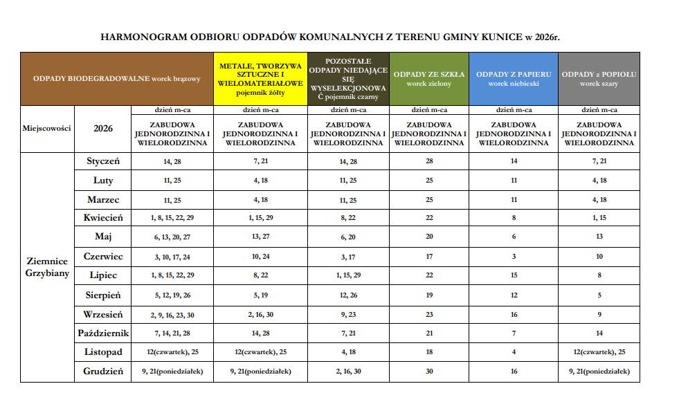 Informujemy, że Punkt Selektywnego Zbierania Odpadów Komunalnych (PSZOK) w Ziemnicach w dniach od 3 do 17 stycznia 2026 r. nie będzie przyjmował odpadów od mieszkańców Gminy Kunice w związku z zaplanowaną w tym okresie inwentaryzacją.