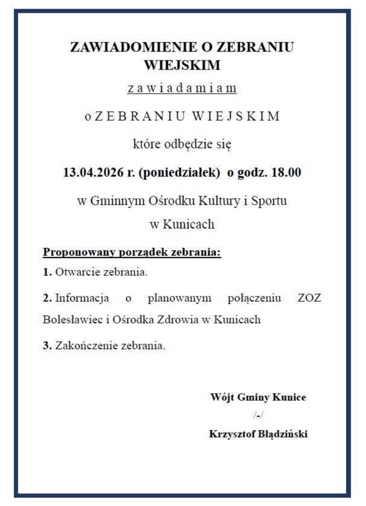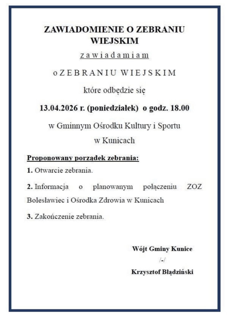 09:04 - 02.4.2026 Kategoria: 1. Aktualności Możliwość komentowania Spotkanie o połączeniu ZOZ Bolesławiec i Ośrodek Zdrowia w Kunicach została wyłączona