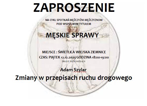 14 listopada 2025 roku w Świetlicy Wiejskiej w Ziemnicach odbyło się spotkanie z Panem Przemysławem Kochem pod tytułem „Sukcesja w rodzinie i firmie”.