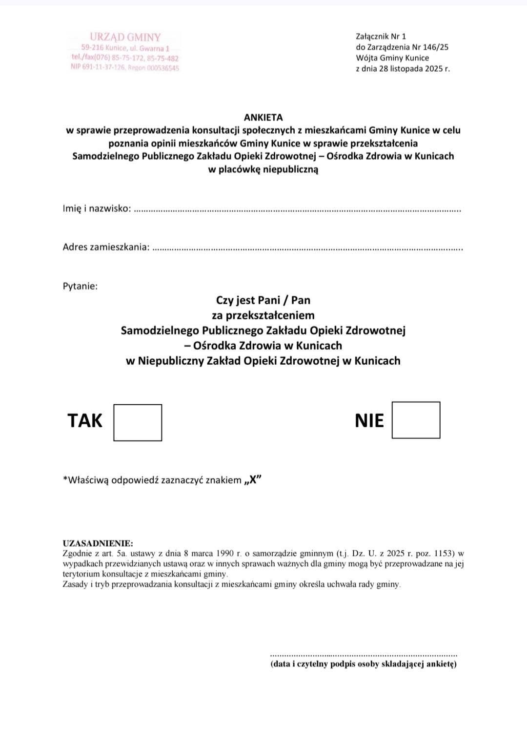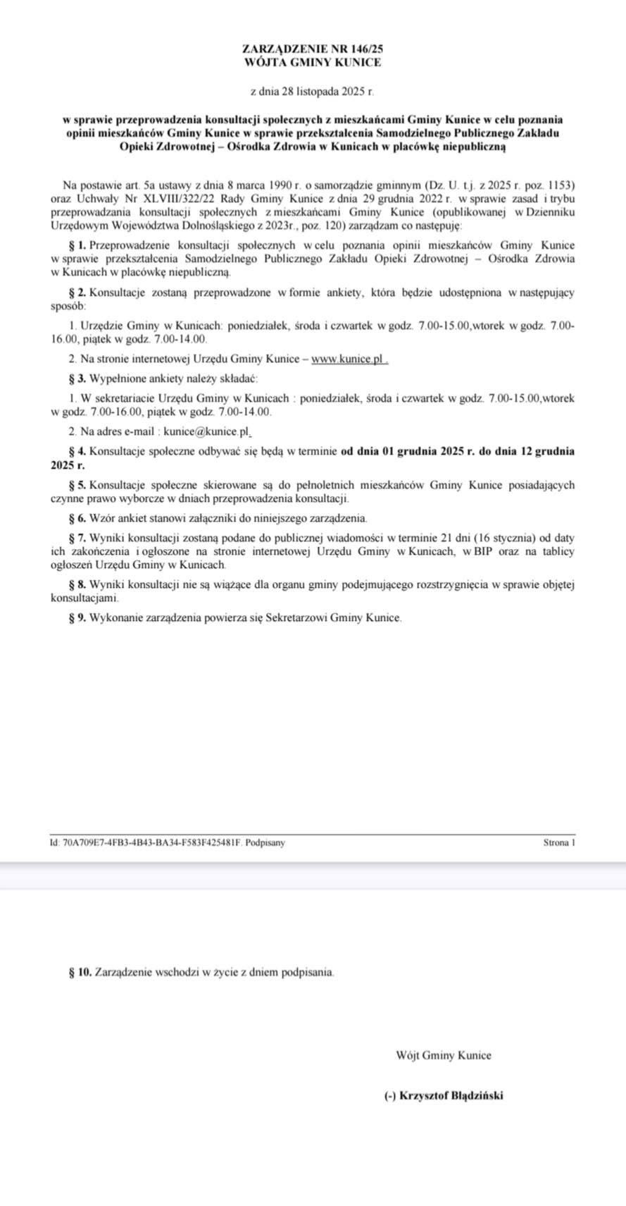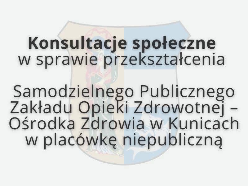 Gmina rozpoczyna konsultacje społeczne dotyczące ewentualnego przekształcenia Samodzielnego Publicznego Zakładu Opieki Zdrowotnej – Ośrodka Zdrowia w Kunicach w placówkę niepubliczną.